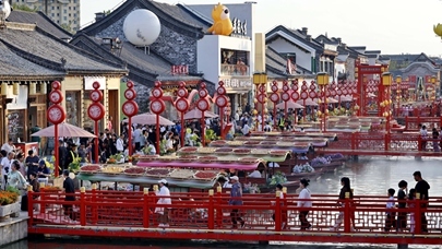 10月3日,游客在河北省唐山市丰南区河头老街景区游玩。