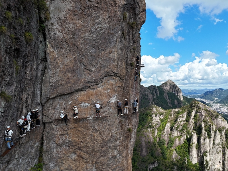 10月4日,游客在浙江省乐清市龙西乡沓屏峰体验“飞拉达”运动(无人机照片)。