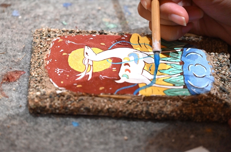 10月4日,在甘肃省敦煌印局研学课堂,游客学习临摹敦煌壁画。