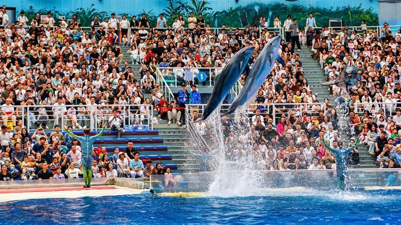 10月4日,在天津市滨海新区极地海洋度假区,游客观看表演。