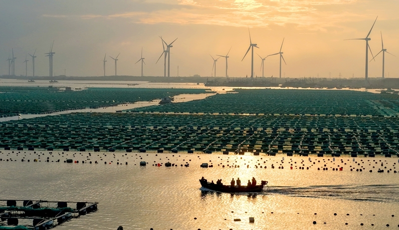 10月4日,在山东省荣成市石岛管理区桑沟湾海洋牧场,渔民出海从事养殖生产。