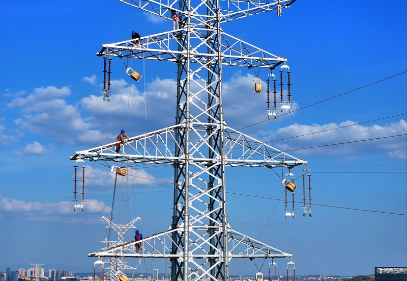 10月3日,在湖南省衡阳市雁峰区岳屏镇,施工人员在真武-麻塘220千伏线路改造工程项目开展架线施工作业 (无人机照片)。