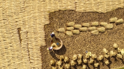 10月3日,农民在云南省大理白族自治州洱源县右所镇收割水稻(无人机照片)。