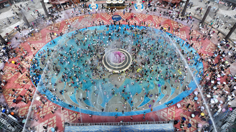 10月5日,游客在云南省景洪市的傣族园景区参加泼水活动(无人机照片)。