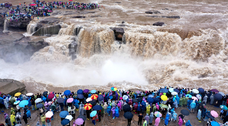 10月5日,游客在山西吉县黄河壶口瀑布景区观瀑(无人机照片)。