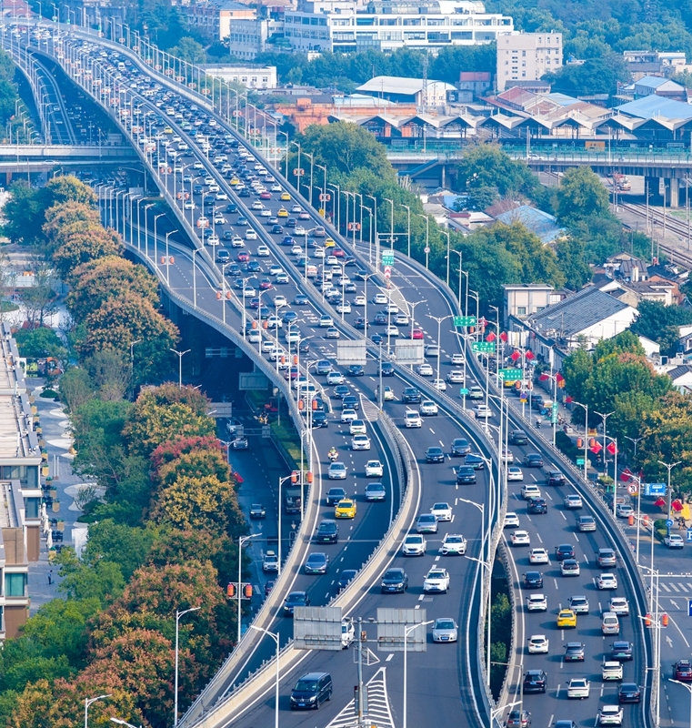 10月7日,车辆行驶在江苏省南京市应天高架上(无人机照片)。