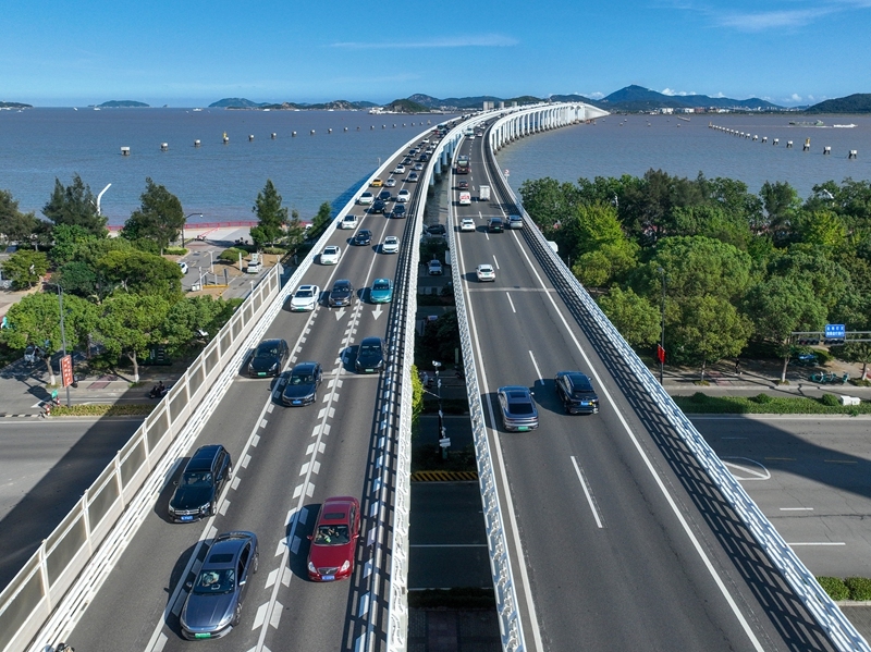 10月7日,在浙江省舟山市普陀区,车辆行驶在朱家尖海峡大桥上(无人机照片)。