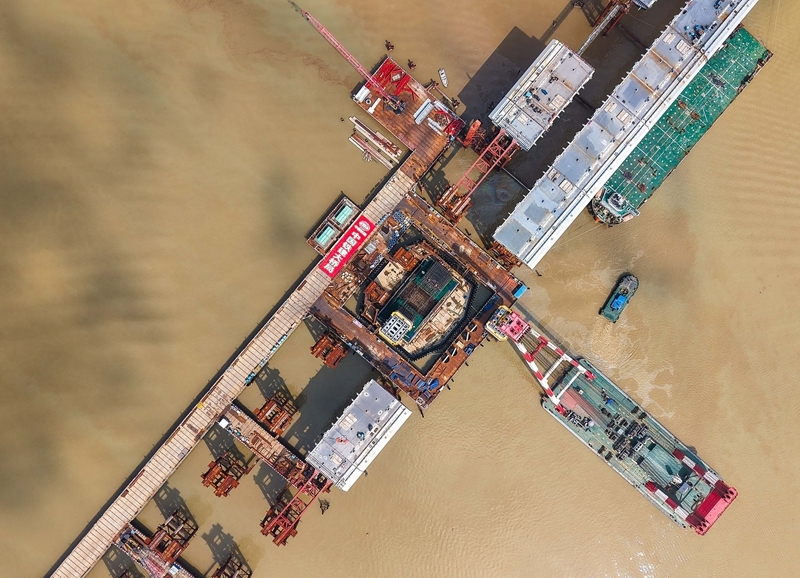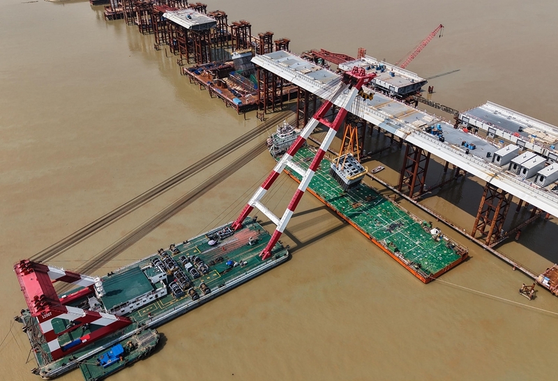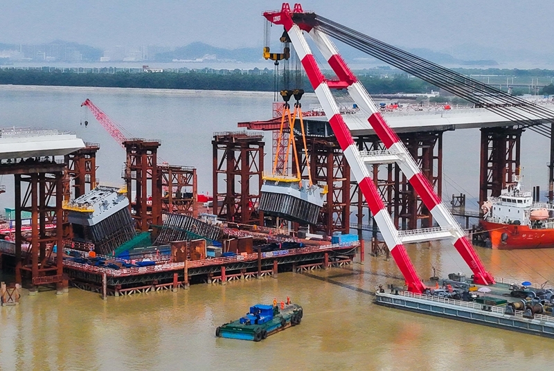 10月10日,由中铁建大桥局承建的万龙大桥吊装架设首节段主塔。位于广州南沙区的万龙大桥跨越珠江口龙穴南水道,全长5146米,主桥长1150米,主跨608米,为粤港澳大湾区又一世界级桥梁。