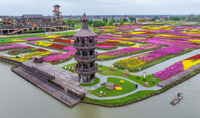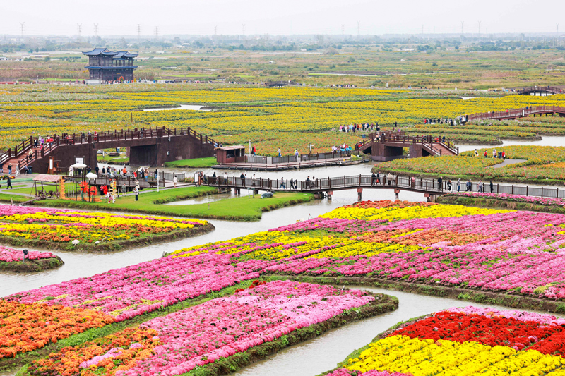 10月18日,游客在江苏省兴化市千垛景区赏花游玩。