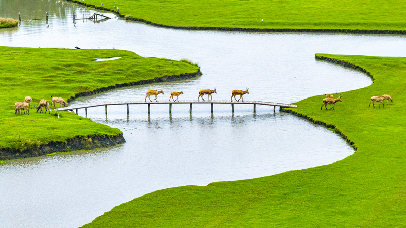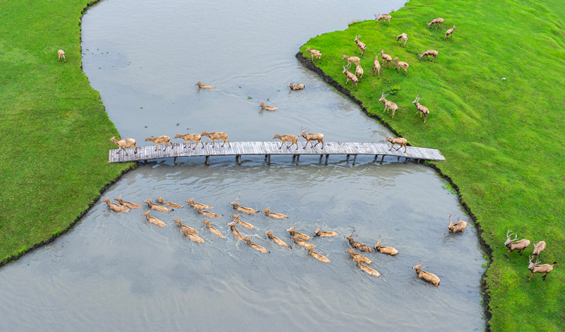 10月17日,在江苏省泰州市姜堰区溱湖国家湿地公园,一群麋鹿通过独木桥(无人机照片)。