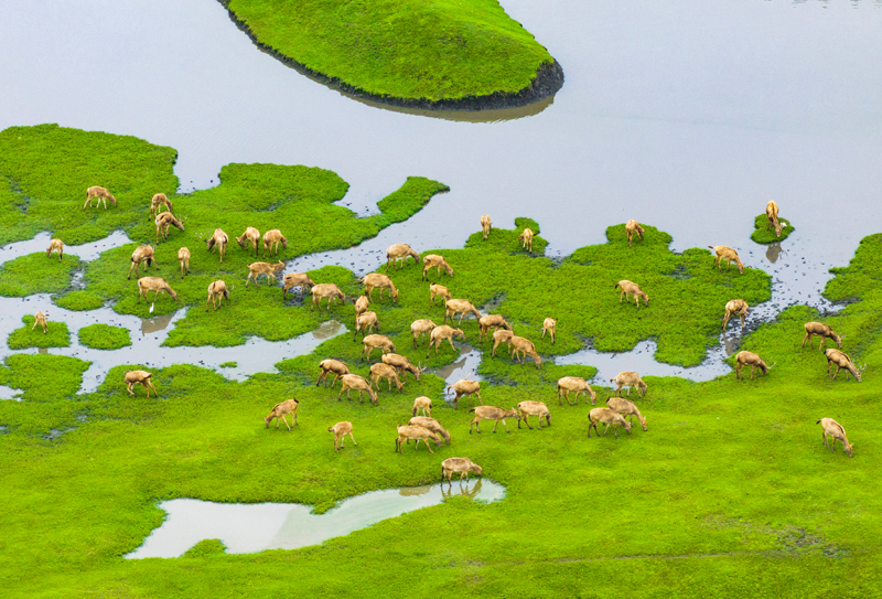 10月17日,在江苏省泰州市姜堰区溱湖国家湿地公园,一群麋鹿在栖息、觅食(无人机照片)。