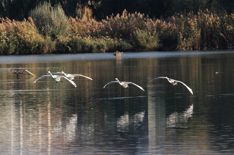 10月17日在甘肃省张掖市国家湿地公园鹤影湖拍摄的白天鹅。