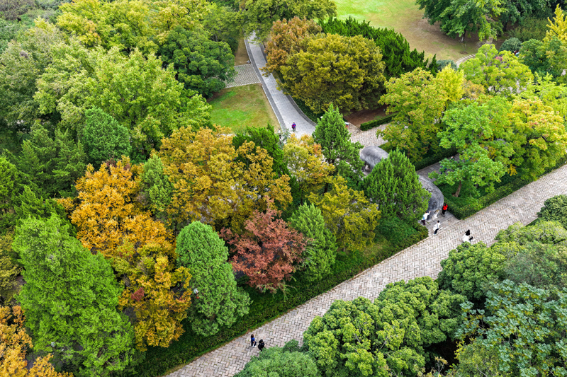 10月17日,游人在南京明孝陵景区石象路赏景游玩(无人机照片)。
