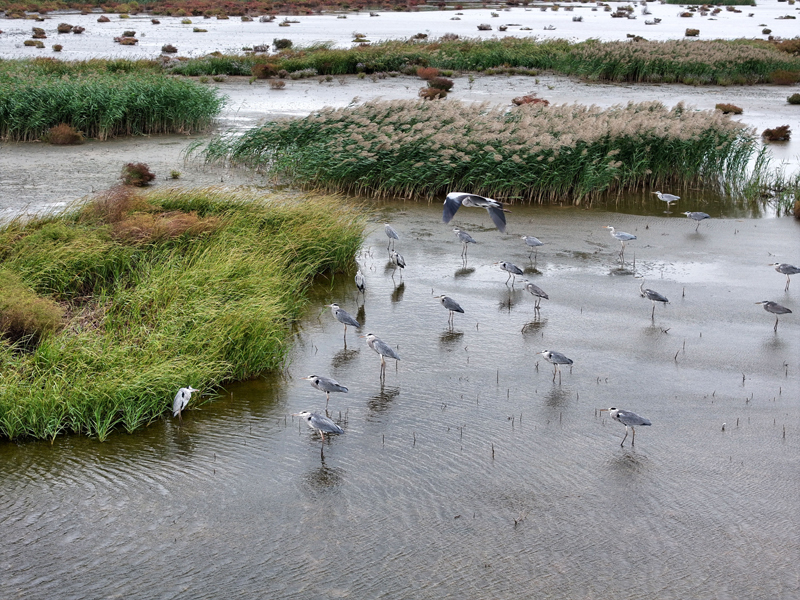 10月18日,一群候鸟在江苏省连云港市海州湾国家级海洋公园湿地栖息、觅食(无人机照片)。