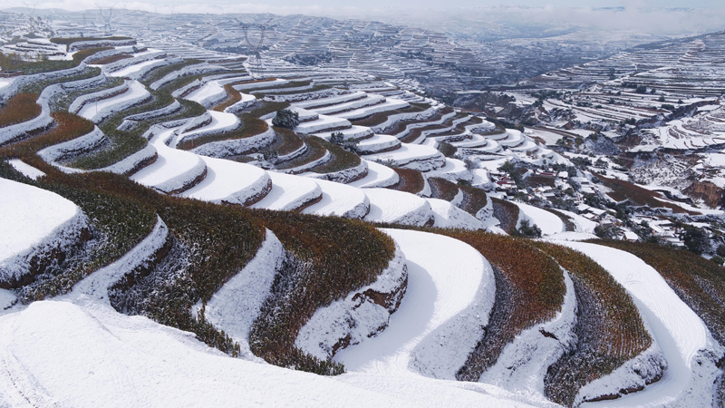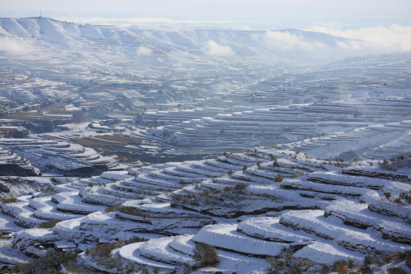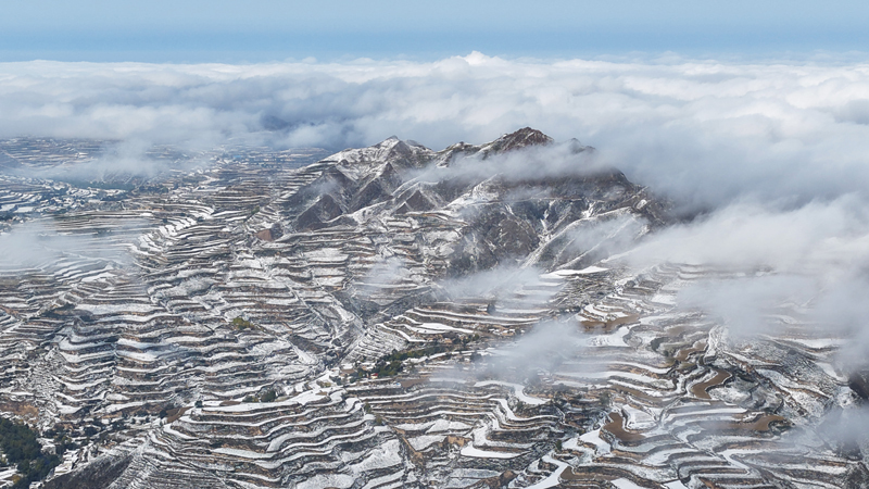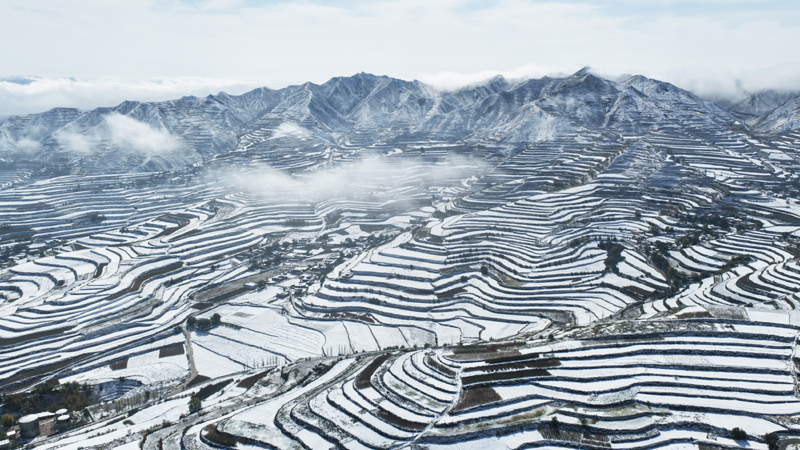 这是10月17日在甘肃永靖县陈井镇拍摄的雪后梯田(无人机照片)。