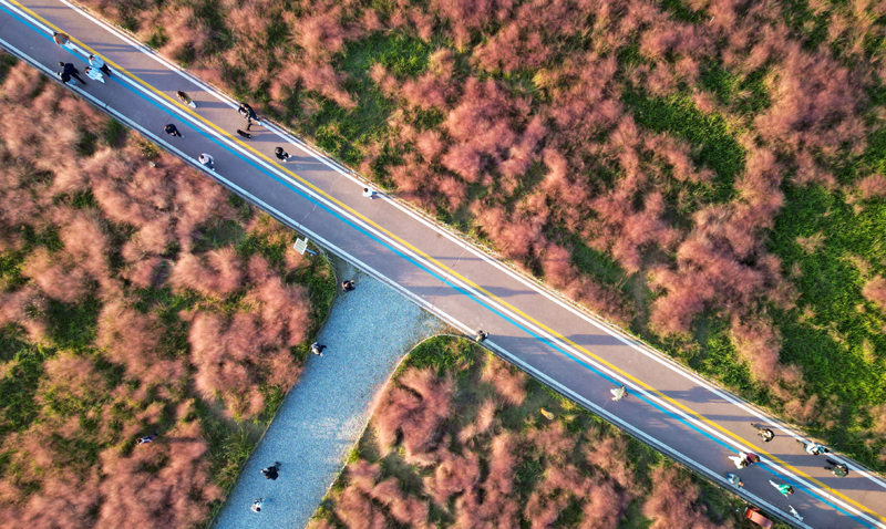 10月18日,游客在山东省东营市东营区耿井湿地粉黛乱子草“花海”拍照打卡(无人机照片)。