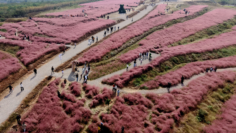 10月18日,游客在山东省临沂市平邑县柏林镇粉黛乱子草花田游玩(无人机照片)。