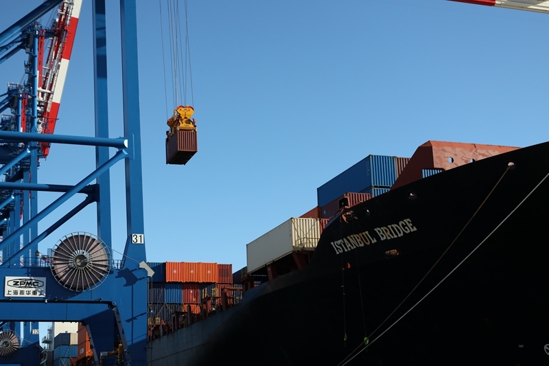 10月19日,在波兰北部格但斯克港,从中国宁波舟山港出发的中欧北极快航航线首艘货船进行装卸工作。