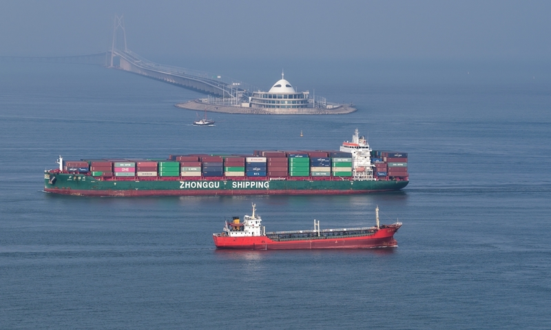 在伶仃洋主航道上的船舶驶过港珠澳大桥西人工岛(10月19日摄,无人机照片)。