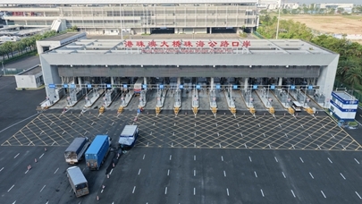 车辆准备通过港珠澳大桥珠海公路口岸边检站(10月19日摄,无人机照片)。