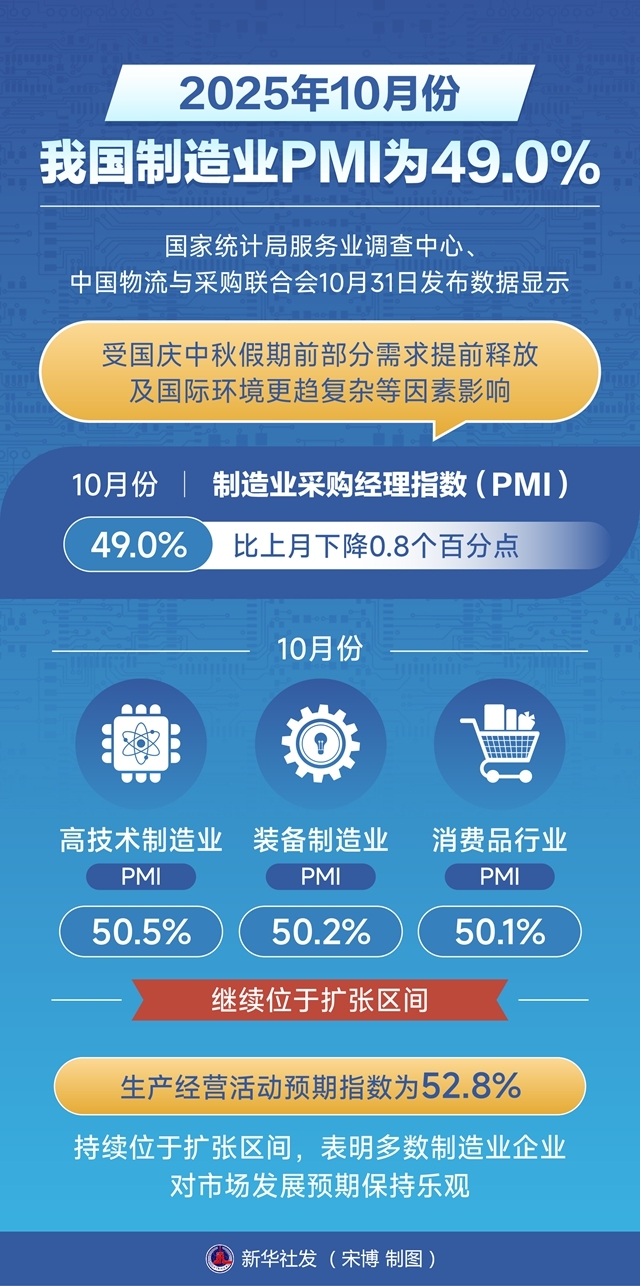国家统计局服务业调查中心、中国物流与采购联合会10月31日发布数据显示,受国庆中秋假期前部分需求提前释放及国际环境更趋复杂等因素影响,10月份,制造业采购经理指数(PMI)为49.0%,比上月下降0.8个百分点。