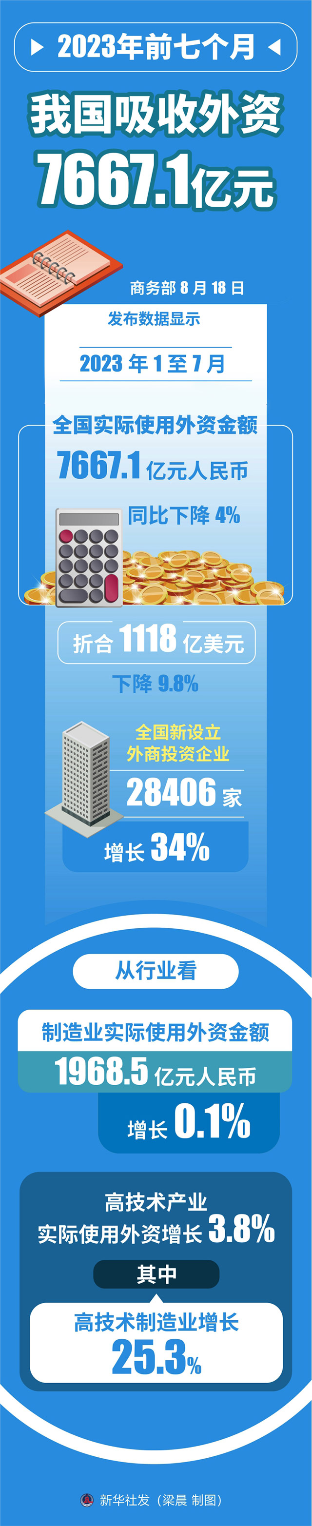 商务部8月18日发布数据显示,2023年1至7月,全国实际使用外资金额7667.1亿元人民币,同比下降4%,折合1118亿美元,下降9.8%。全国新设立外商投资企业28406家,增长34%。