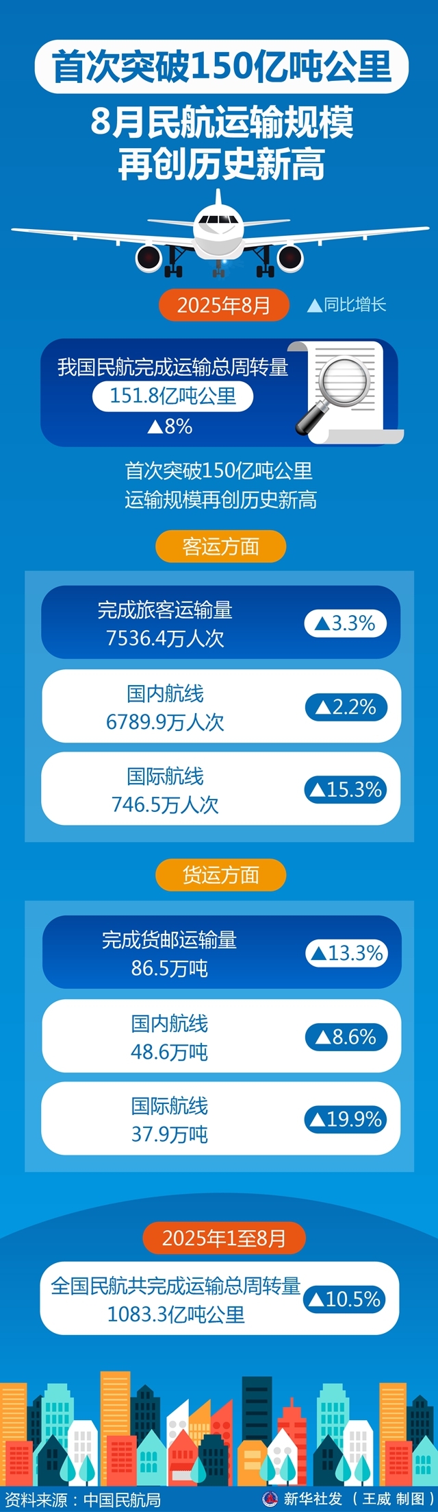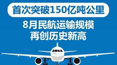 记者9月19日从中国民航局了解到,8月,我国民航完成运输总周转量151.8亿吨公里,同比增长8%,首次突破150亿吨公里,运输规模再创历史新高。
