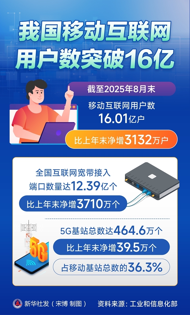 记者9月23日从工业和信息化部获悉,2025年前8个月,我国通信业呈现平稳运行态势。其中移动互联网流量延续较快增势,截至8月末,移动互联网用户数达16.01亿户,比上年末净增3132万户。