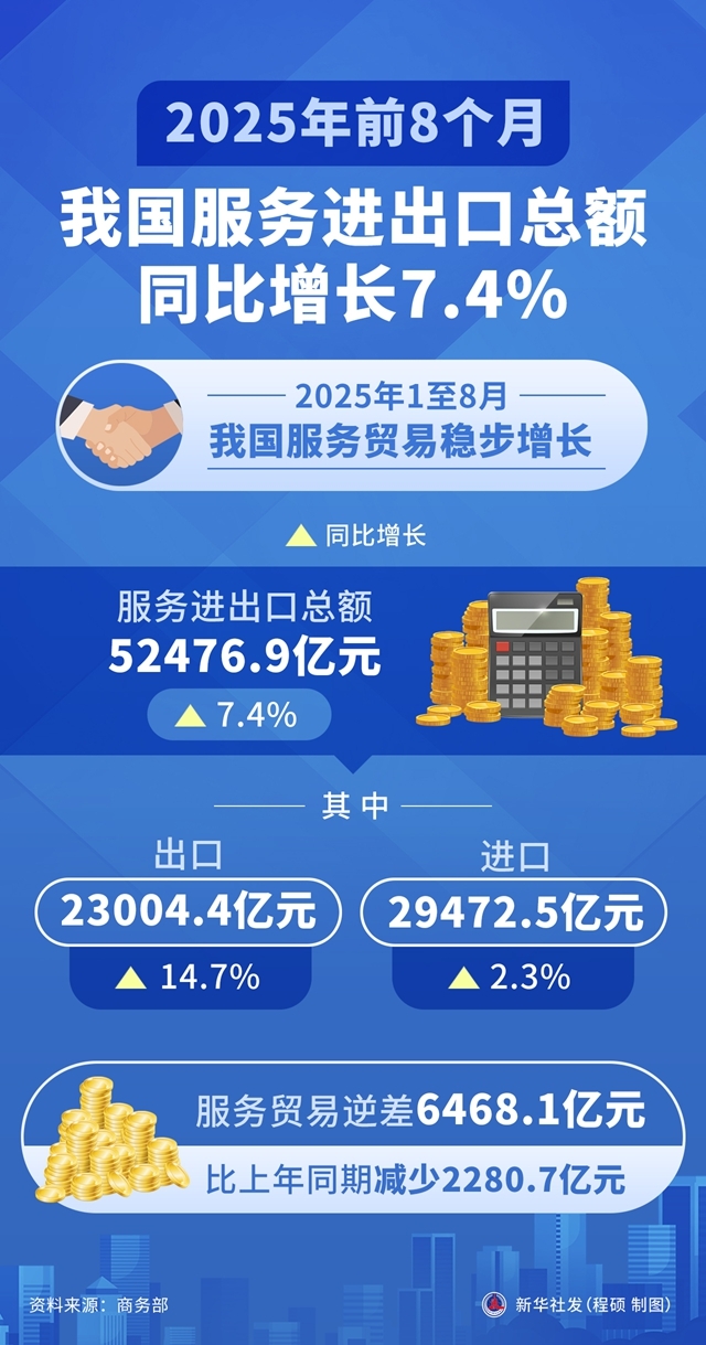 记者9月30日从商务部获悉,2025年1至8月,我国服务贸易稳步增长,服务进出口总额52476.9亿元,同比增长7.4%。其中,出口23004.4亿元,增长14.7%;进口29472.5亿元,增长2.3%。服务贸易逆差6468.1亿元,比上年同期减少2280.7亿元。