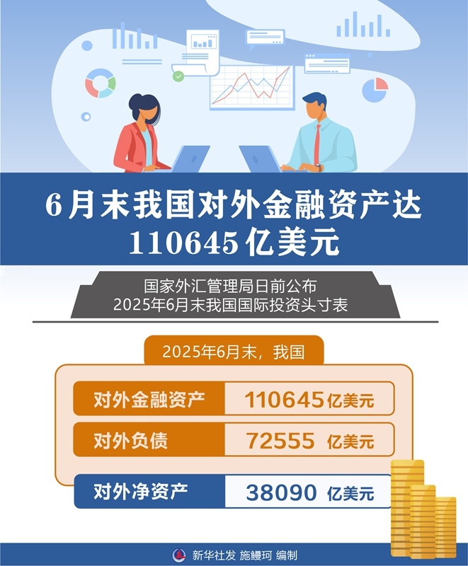 国家外汇管理局日前公布2025年6月末我国国际投资头寸表。数据显示,2025年6月末,我国对外金融资产110645亿美元,对外负债72555亿美元,对外净资产38090亿美元。