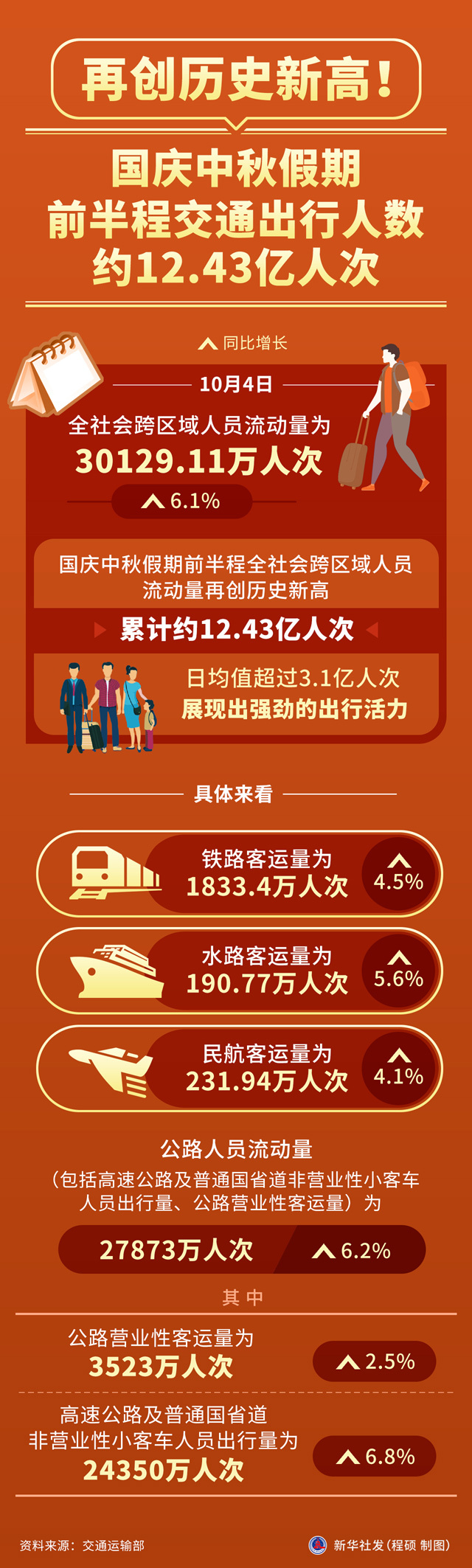 图表:再创历史新高!国庆中秋假期前半程交通出行人数约12.43亿人次