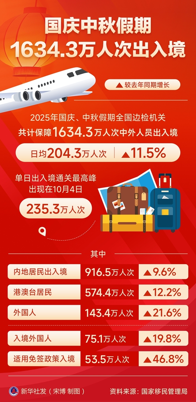 记者10月9日从国家移民管理局获悉,今年国庆、中秋假期全国边检机关共计保障1634.3万人次中外人员出入境,日均204.3万人次,较去年同期增长11.5%,单日出入境通关最高峰出现在10月4日,达235.3万人次。