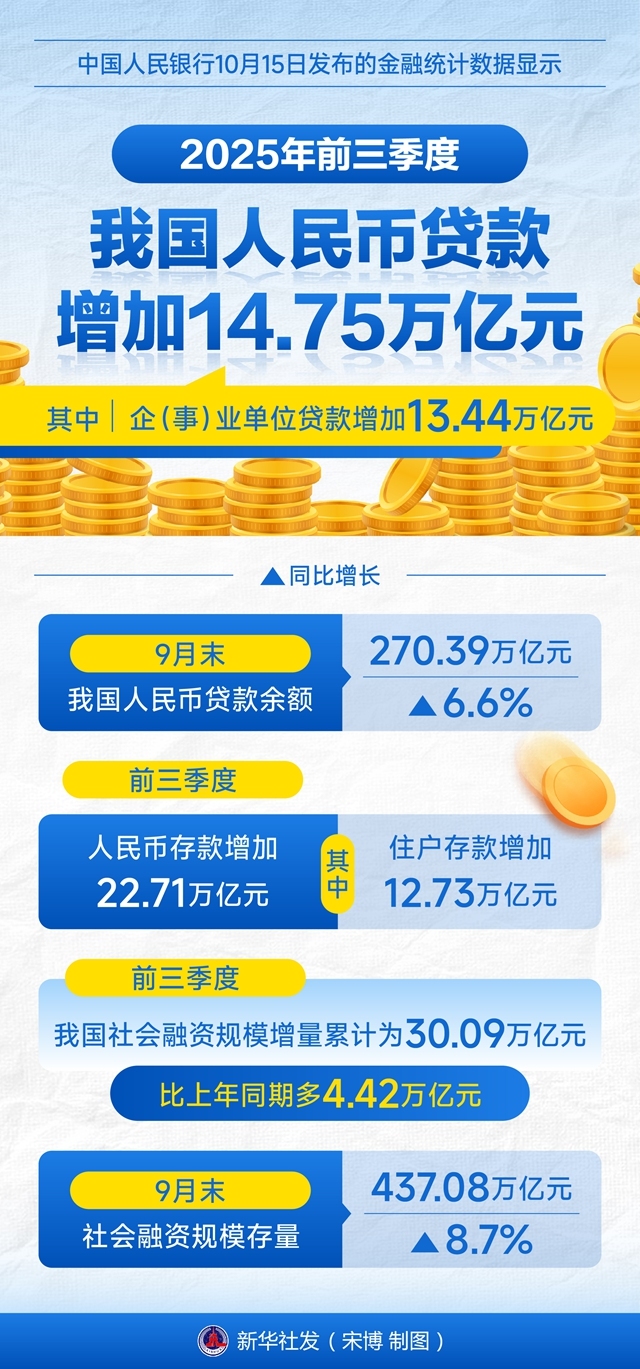 中国人民银行10月15日发布的金融统计数据显示,2025年前三季度我国人民币贷款增加14.75万亿元,其中企(事)业单位贷款增加13.44万亿元。