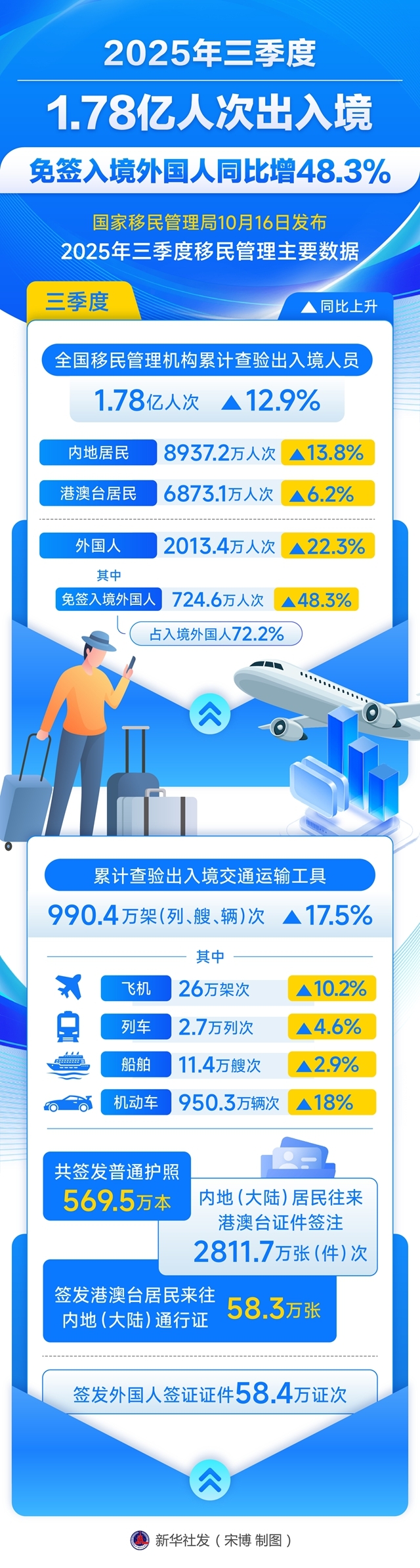 国家移民管理局10月16日发布2025年三季度移民管理主要数据。三季度,全国移民管理机构累计查验出入境人员1.78亿人次,同比上升12.9%。