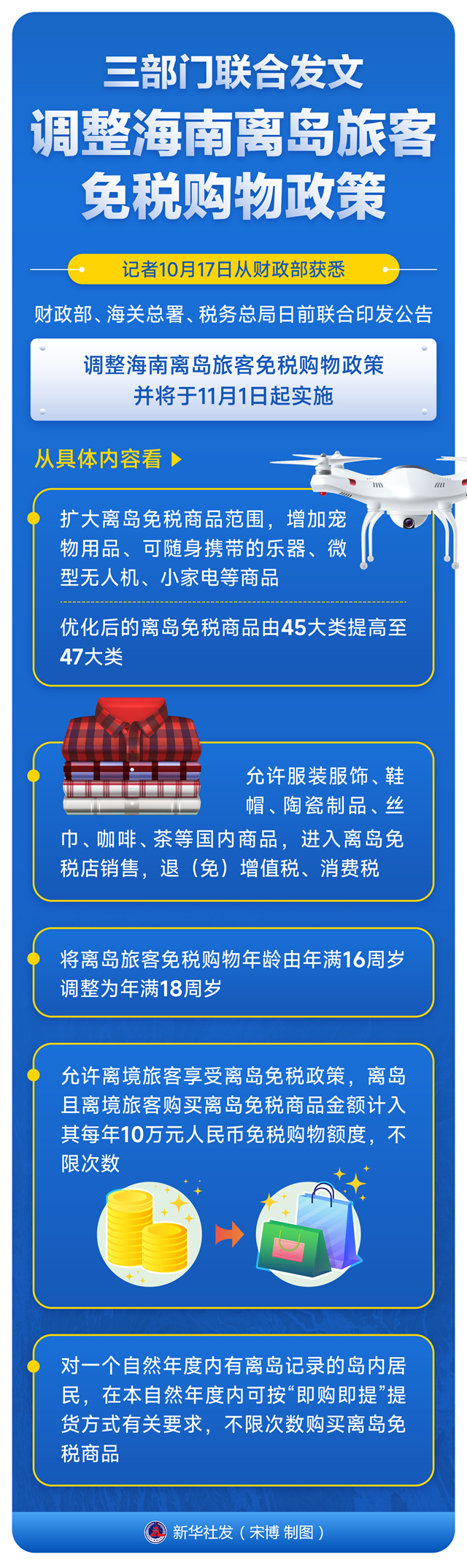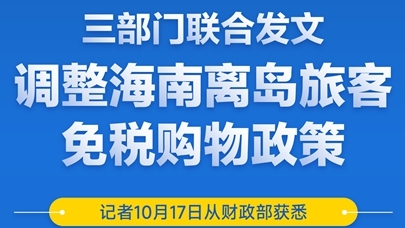 记者10月17日从财政部获悉,财政部、海关总署、税务总局日前联合印发公告,为稳步推进海南自由贸易港建设,进一步满足消费者多元化购物需求,调整海南离岛旅客免税购物政策,并将于11月1日起实施。