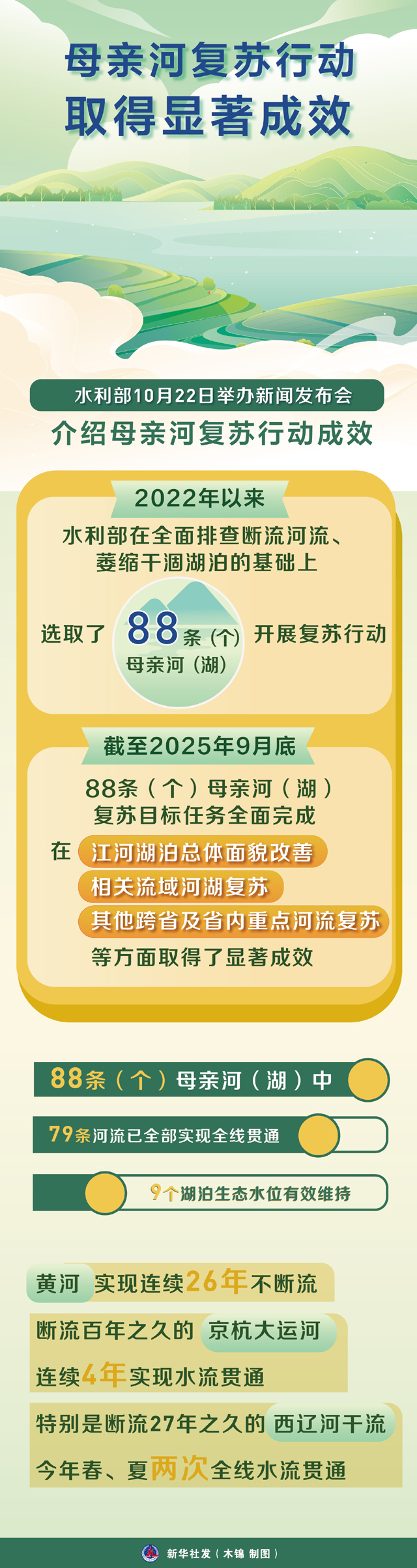 2022年以来,水利部在全面排查断流河流、萎缩干涸湖泊的基础上,选取了88条(个)母亲河(湖)开展复苏行动。截至2025年9月底,88条(个)母亲河(湖)复苏目标任务全面完成,在江河湖泊总体面貌改善、相关流域河湖复苏、其他跨省及省内重点河流复苏等方面取得了显著成效。