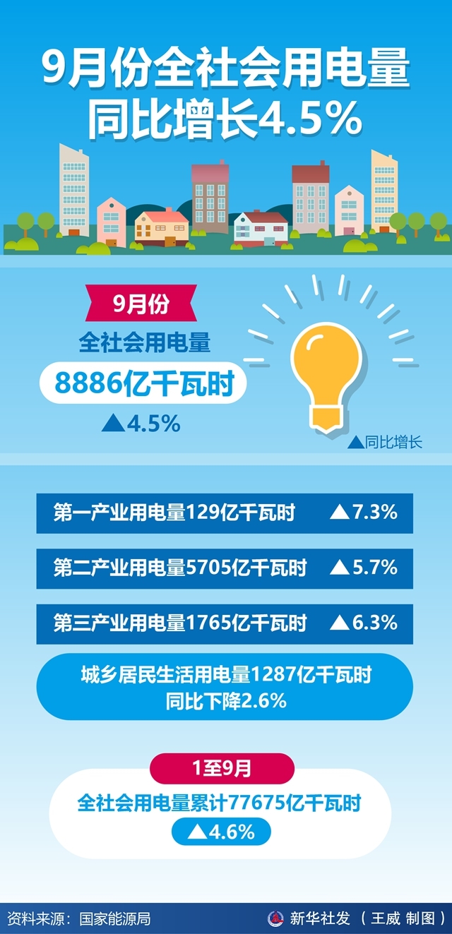 国家能源局10月23日发布信息显示,9月份全社会用电量8886亿千瓦时,同比增长4.5%。