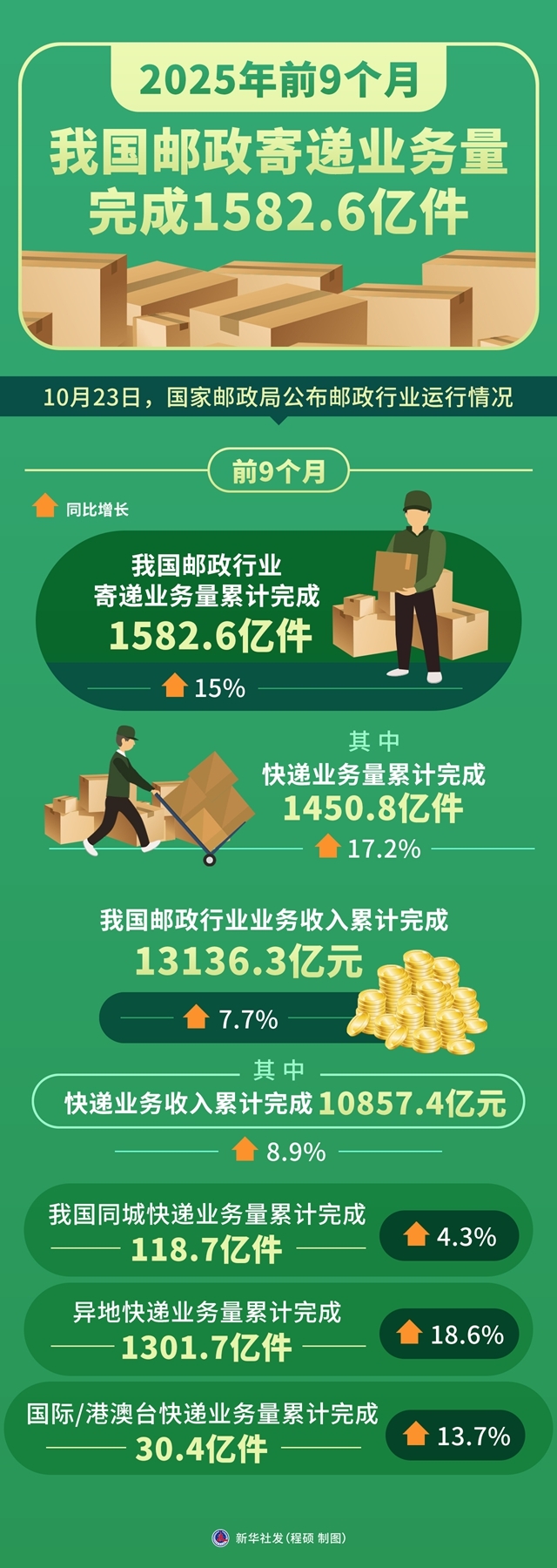 记者10月23日从国家邮政局获悉,前9个月,我国邮政行业寄递业务量累计完成1582.6亿件,同比增长15%。其中,快递业务量累计完成1450.8亿件,同比增长17.2%。