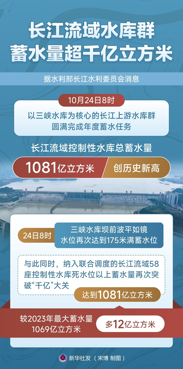 据水利部长江水利委员会消息,10月24日8时,以三峡水库为核心的长江上游水库群圆满完成年度蓄水任务,长江流域控制性水库总蓄水量达1081亿立方米,创历史新高。