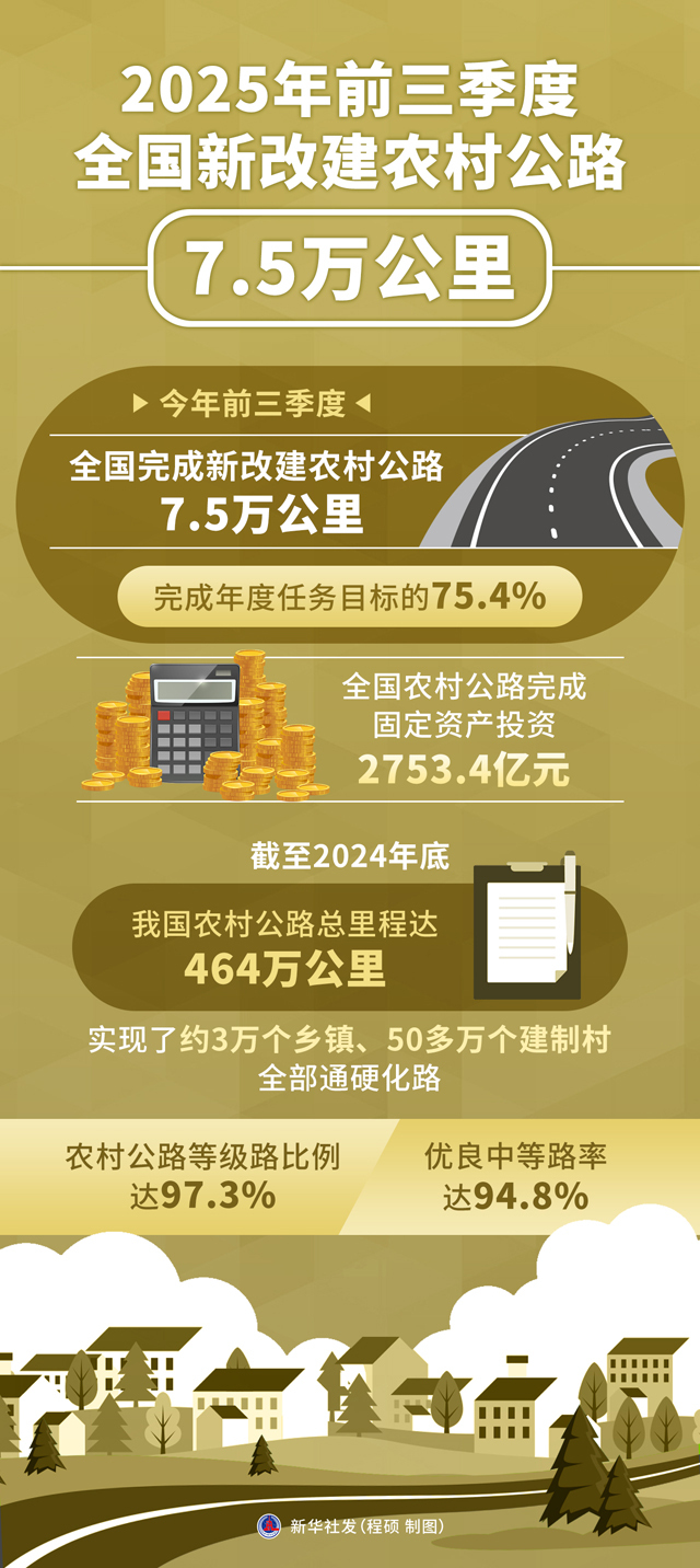今年前三季度,全国完成新改建农村公路7.5万公里,完成年度任务目标的75.4%;全国农村公路完成固定资产投资2753.4亿元。
