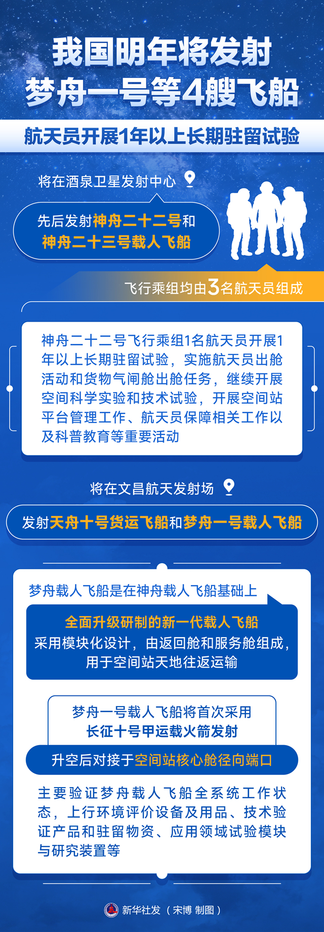 图表:我国明年将发射梦舟一号等4艘飞船 航天员开展1年以上长期驻留试验