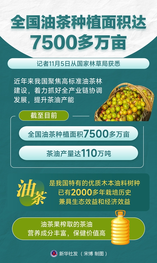 记者11月5日从国家林草局获悉,近年来我国聚焦高标准油茶林建设,着力抓好全产业链协调发展,提升茶油产能。截至目前,全国油茶种植面积7500多万亩,茶油产量达110万吨。
