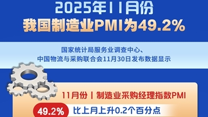国家统计局服务业调查中心、中国物流与采购联合会11月30日发布数据显示,11月份,制造业采购经理指数(PMI)为49.2%,比上月上升0.2个百分点,景气水平有所改善。