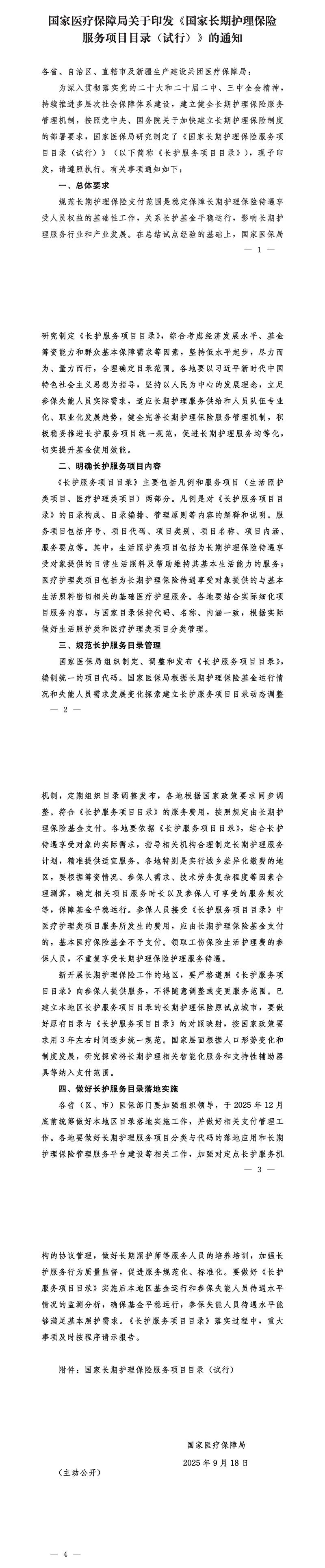 题: 国家医疗保障局关于印发《国家长期护理保险服务项目目录(试行)》的通知 发文机关: ​国家医保局