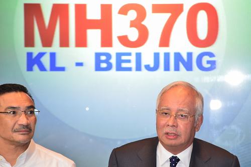 3月15日,马来西亚总理纳吉布(右)在吉隆坡国际机场附近的一个酒店举行有关马航失联客机的记者会。马来西亚总理纳吉布当日在新闻发布会上说,正在就马航失联客机被劫持的可能性进行调查。新华社发(张纹综 摄)