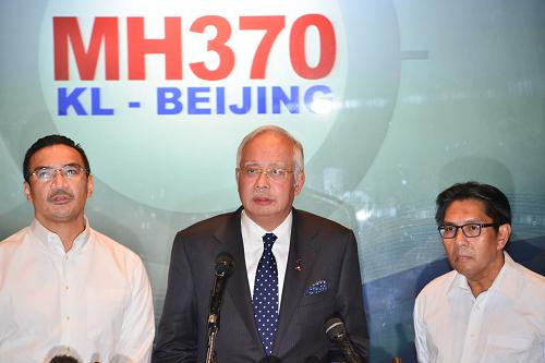 3月15日,马来西亚总理纳吉布(中)在吉隆坡国际机场附近的一个酒店举行有关马航失联客机的记者会。马来西亚总理纳吉布当日在新闻发布会上说,正在就马航失联客机被劫持的可能性进行调查。新华社发(张纹综 摄)